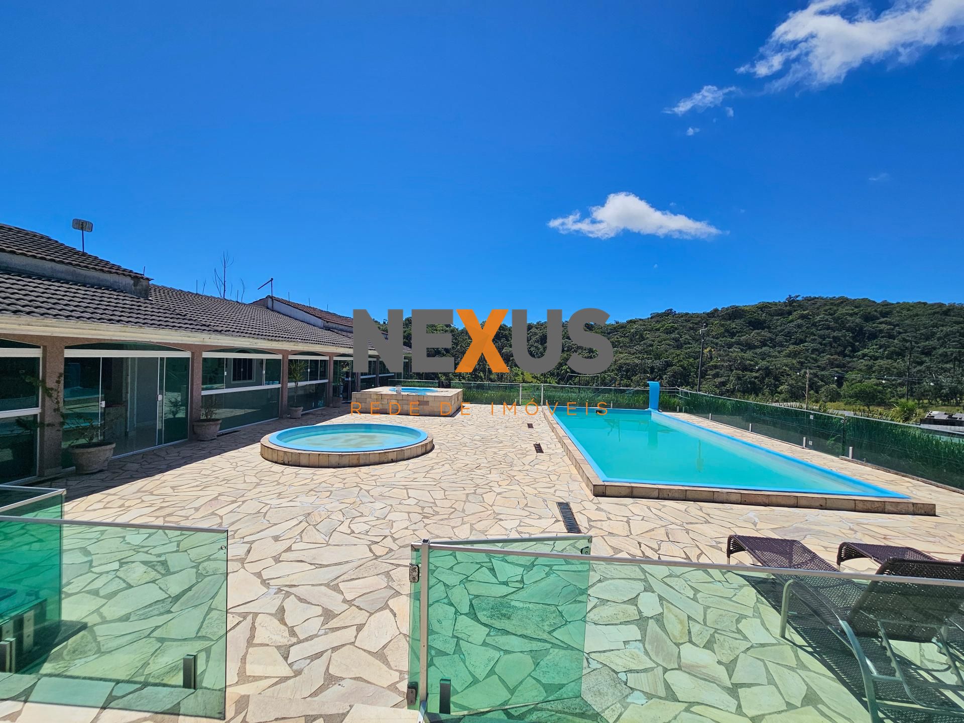 Logo na entrada, à direita, há garagem coberta e fechada com portão basculante para até 4 carros. No mesmo espaço encontra-se um salão de jogos, equipado com mesa de sinuca, churrasqueiras e 02 banheiros. A propriedade conta ainda com depósito para materiais e ferramentas, canil e baia para cavalos, oferecendo excelente estrutura para quem aprecia vida no campo.